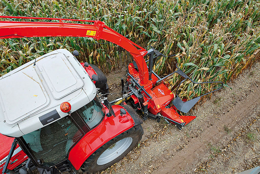 Drei Maishäcksler: ein-, zwei- oder vierreihig – Leistungsbedarf gering – ausgezeichnete Schnittqualität bei Häcksellängen von 4 mm oder 6mm dank des Einzugssystems über eine glatte, gezackte Walze sowie der verstellbaren Drehzahl des Häckselorgans – Heckanbau mit Serienaufnahme bei den 1- und 2-reihigen Ausführungen, mit Rückfahreinrichtung oder im Frontanbau beim 4-reihigen Maishäcksler.